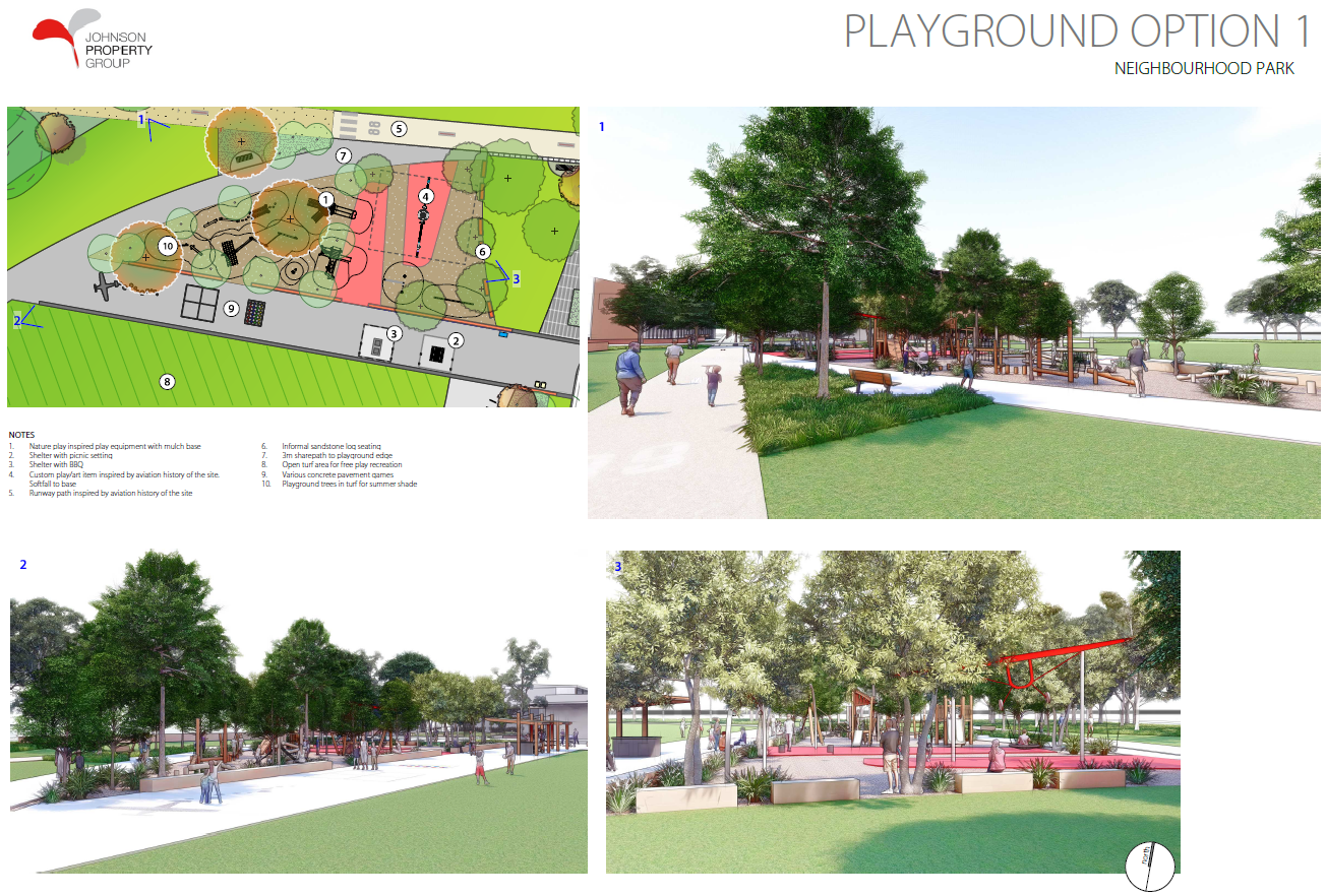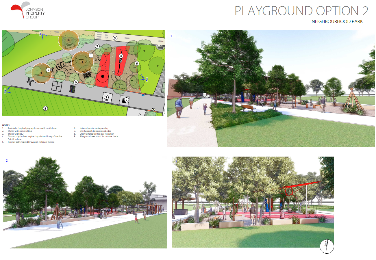 - a custom playable public art item will be incorporated into the playground design comprising a swing inspired by the aviation history of the site.