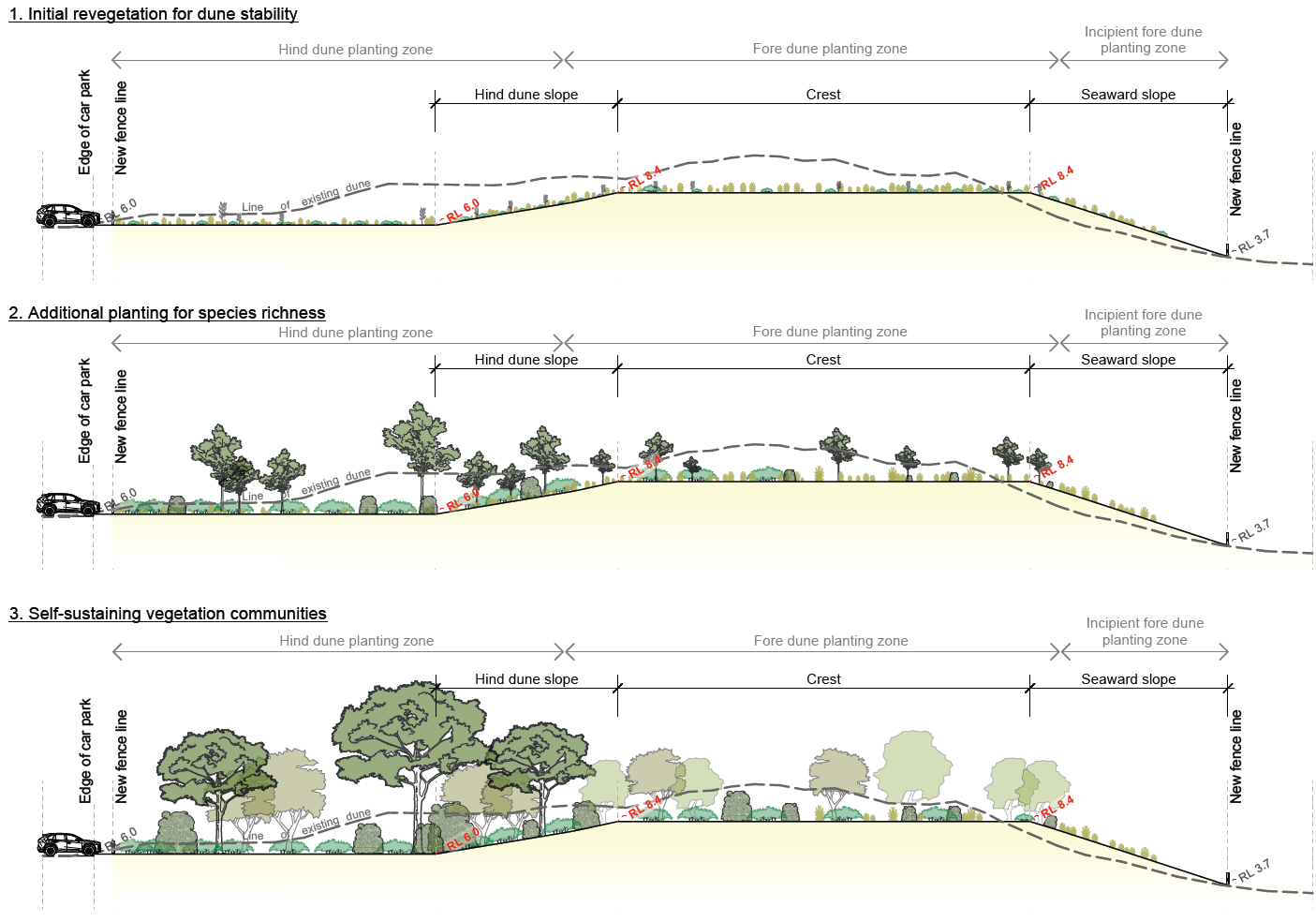 The plan focuses on the dune closest to the surf life saving club, and builds on actions we've already taken at Redhead to stablise the dune and prevent future displacement of sand.The plan involves: