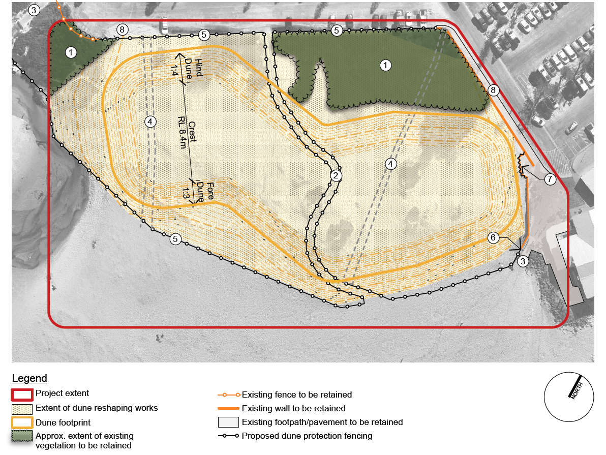 While work has been undertaken previously to relocate sand deposits and help stabilise the dune, this suite of works is more significant and involves using earthmoving equipment to reshape the dune so it is well anchored and can better withstand the natural forces present along the coast.